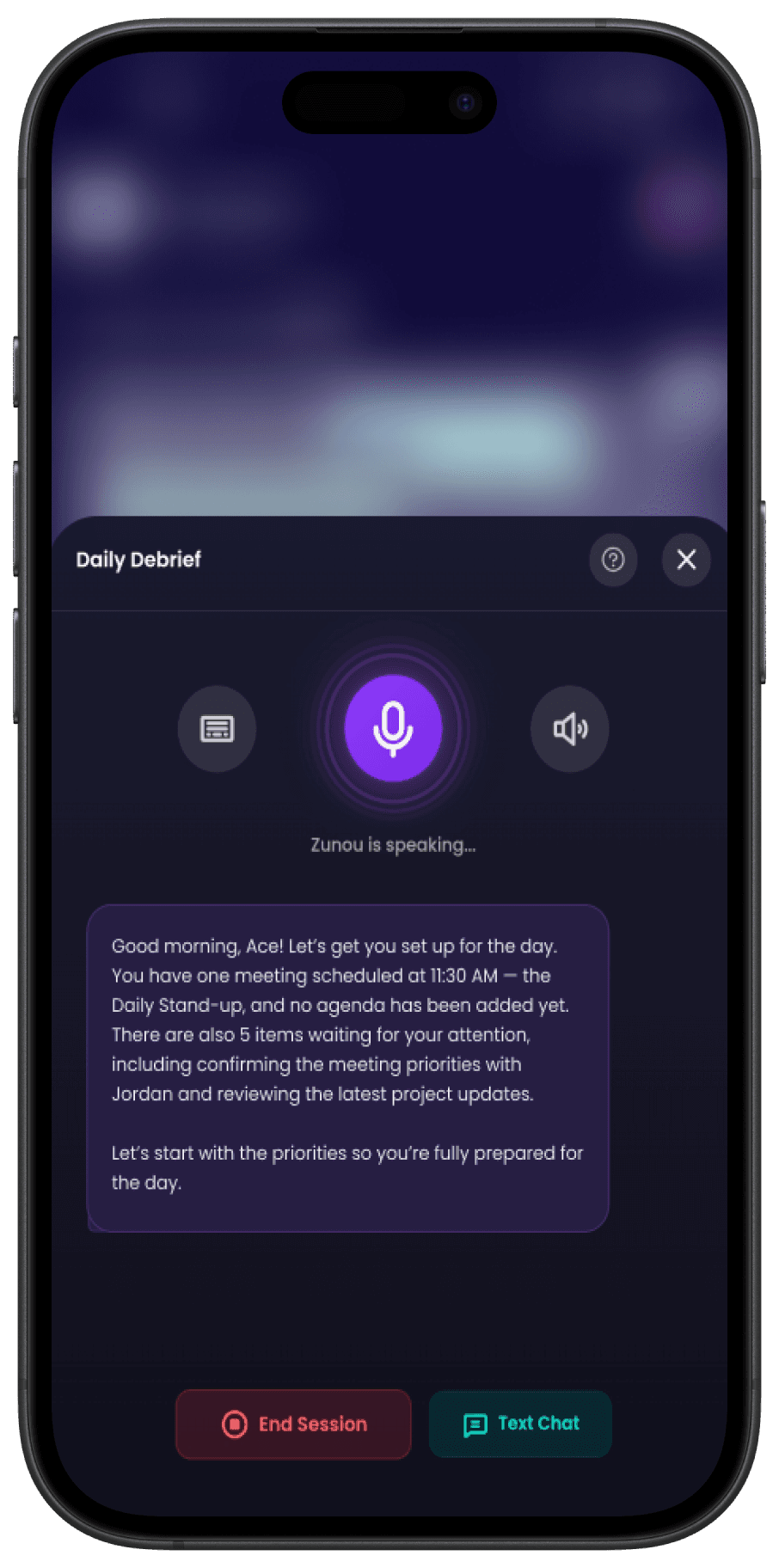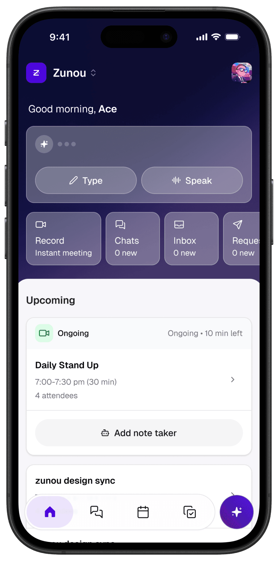 Ask Zunou anything by voice or chat: tasks, meetings, updates, and more.
